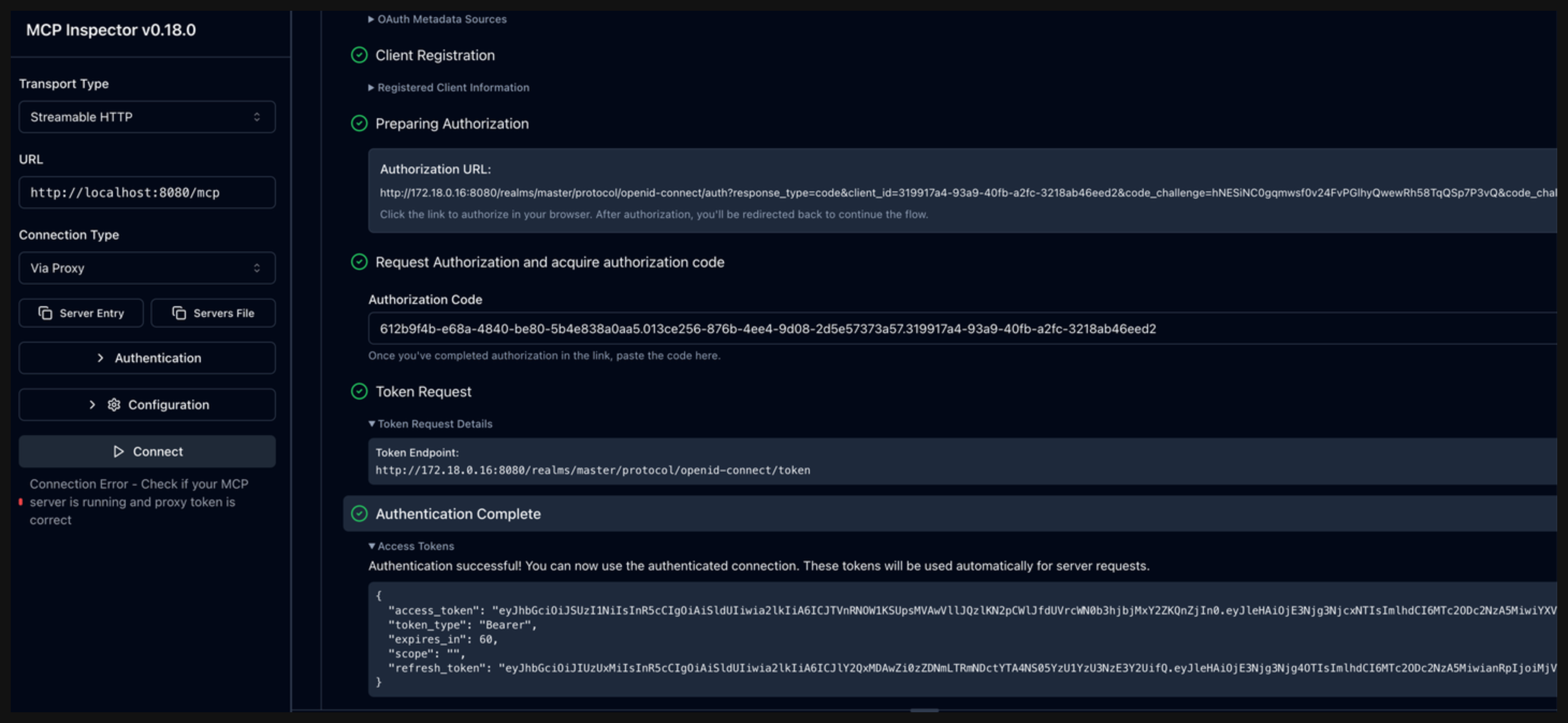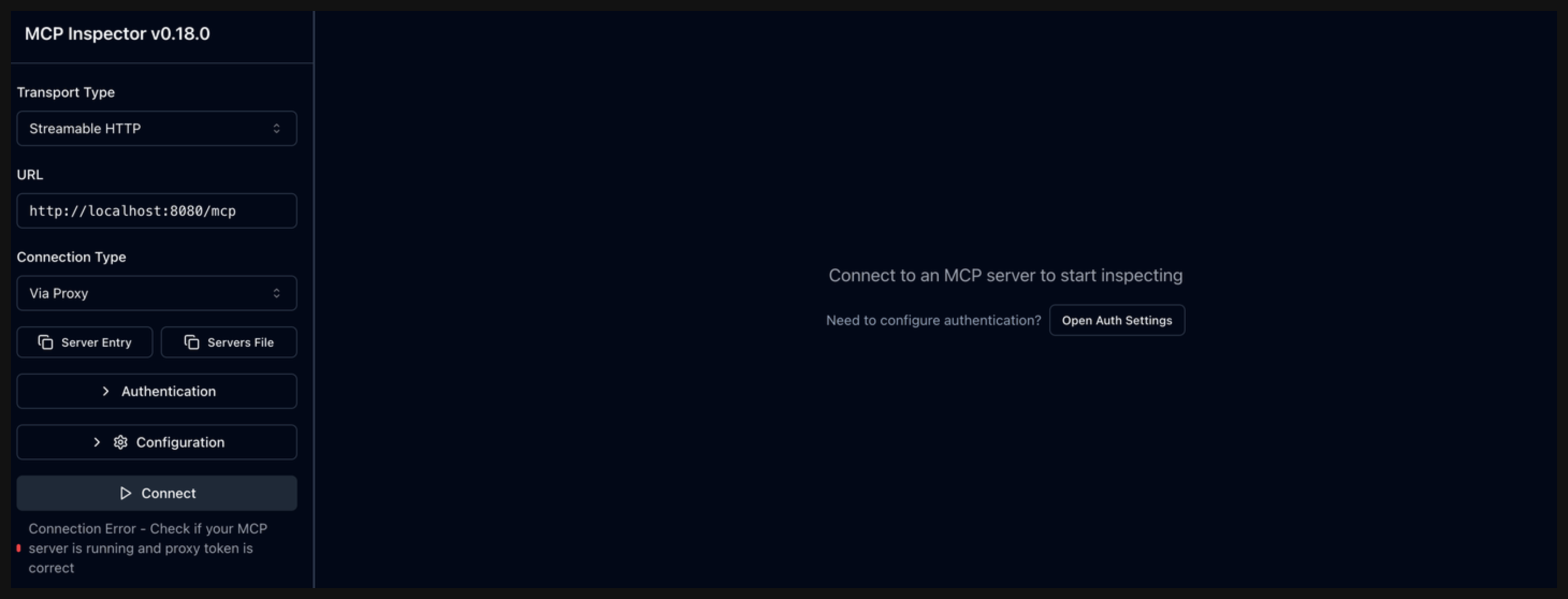 Verify that the connection fails, because authentication is required to access the MCP server.
