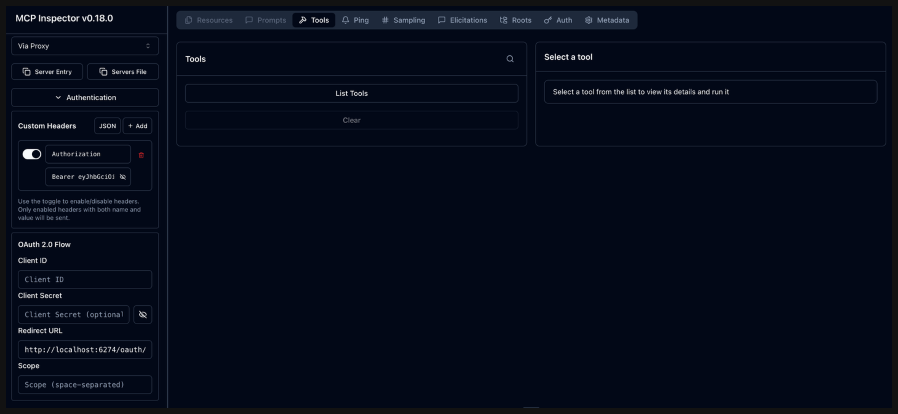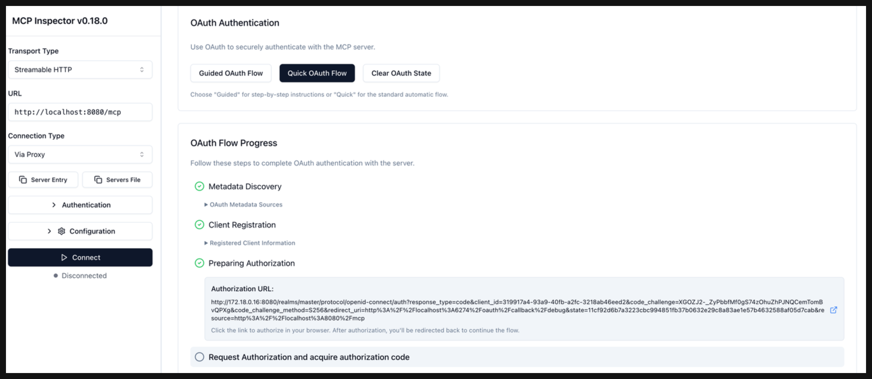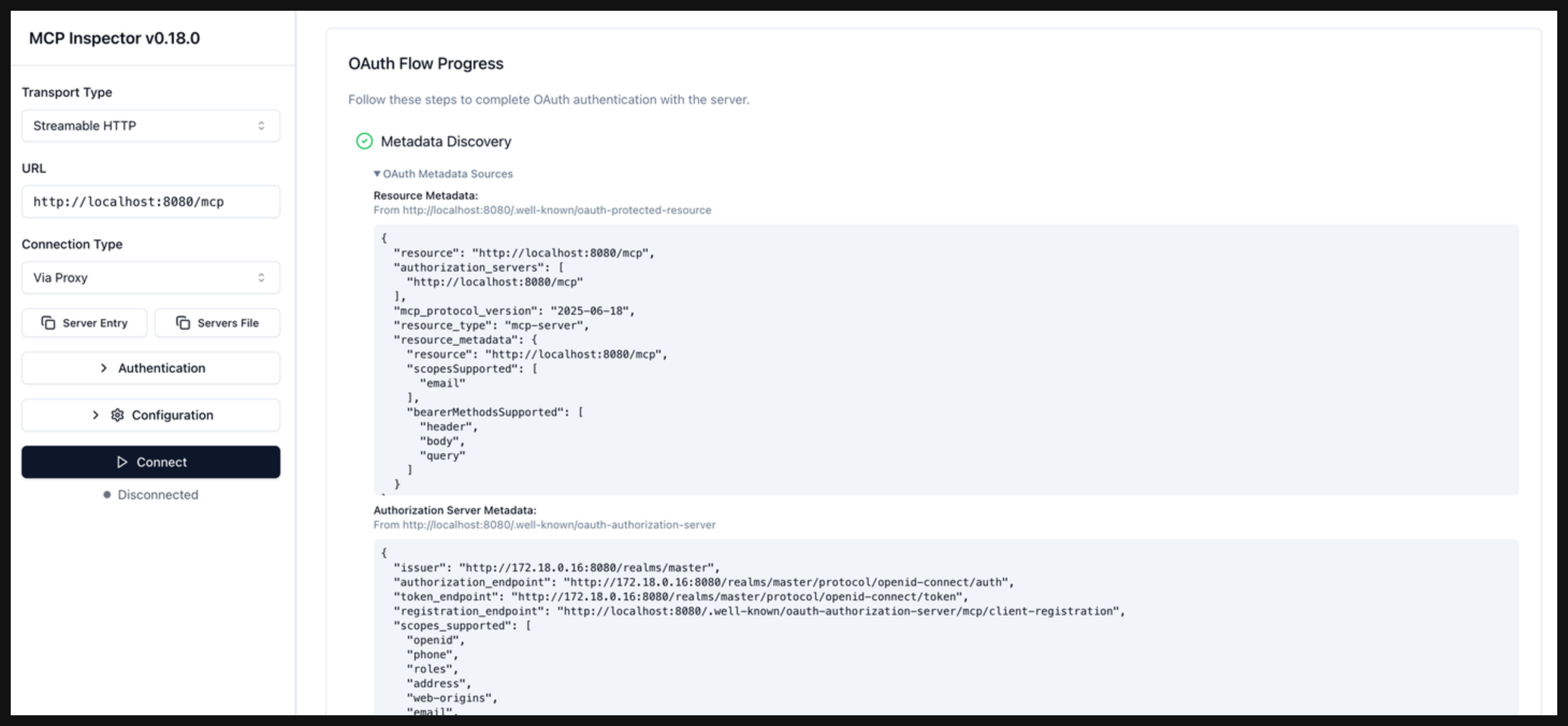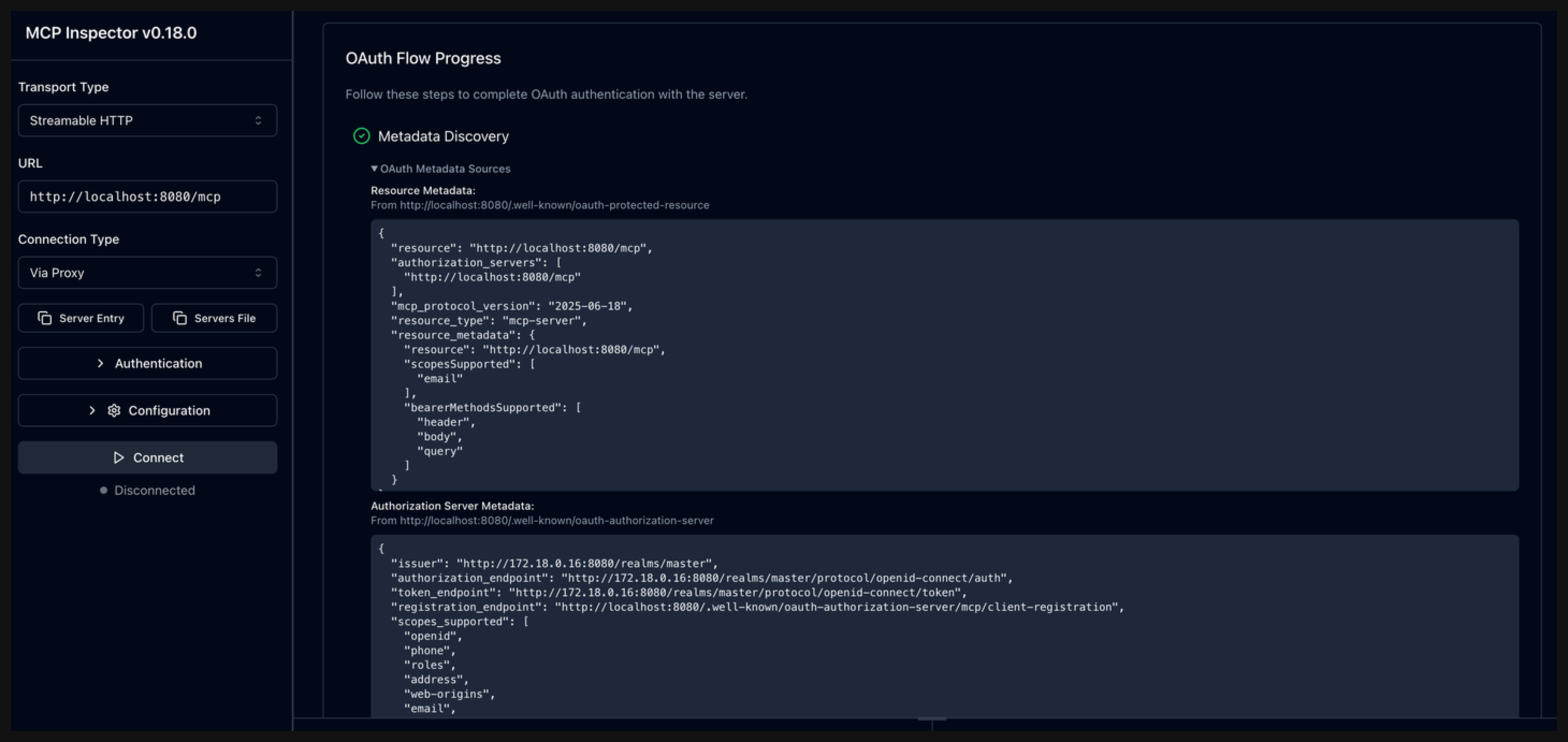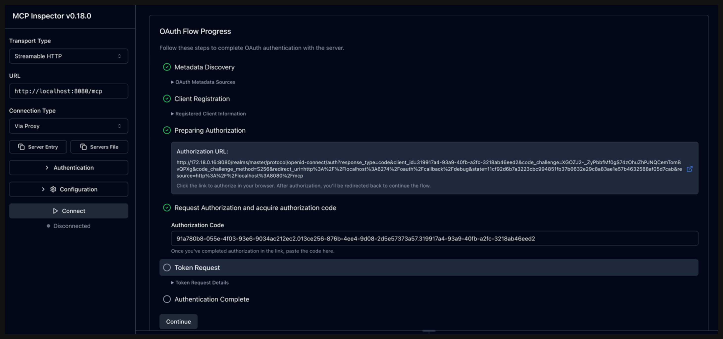 1. In the OAuth Flow Progress card, click Continue to start the Metadata Discovery phase. Verify that the step succeeds and that you see the authorization server metadata. The metadata include information about the location of the authorization server, supported scopes, and ways to provide the bearer token.