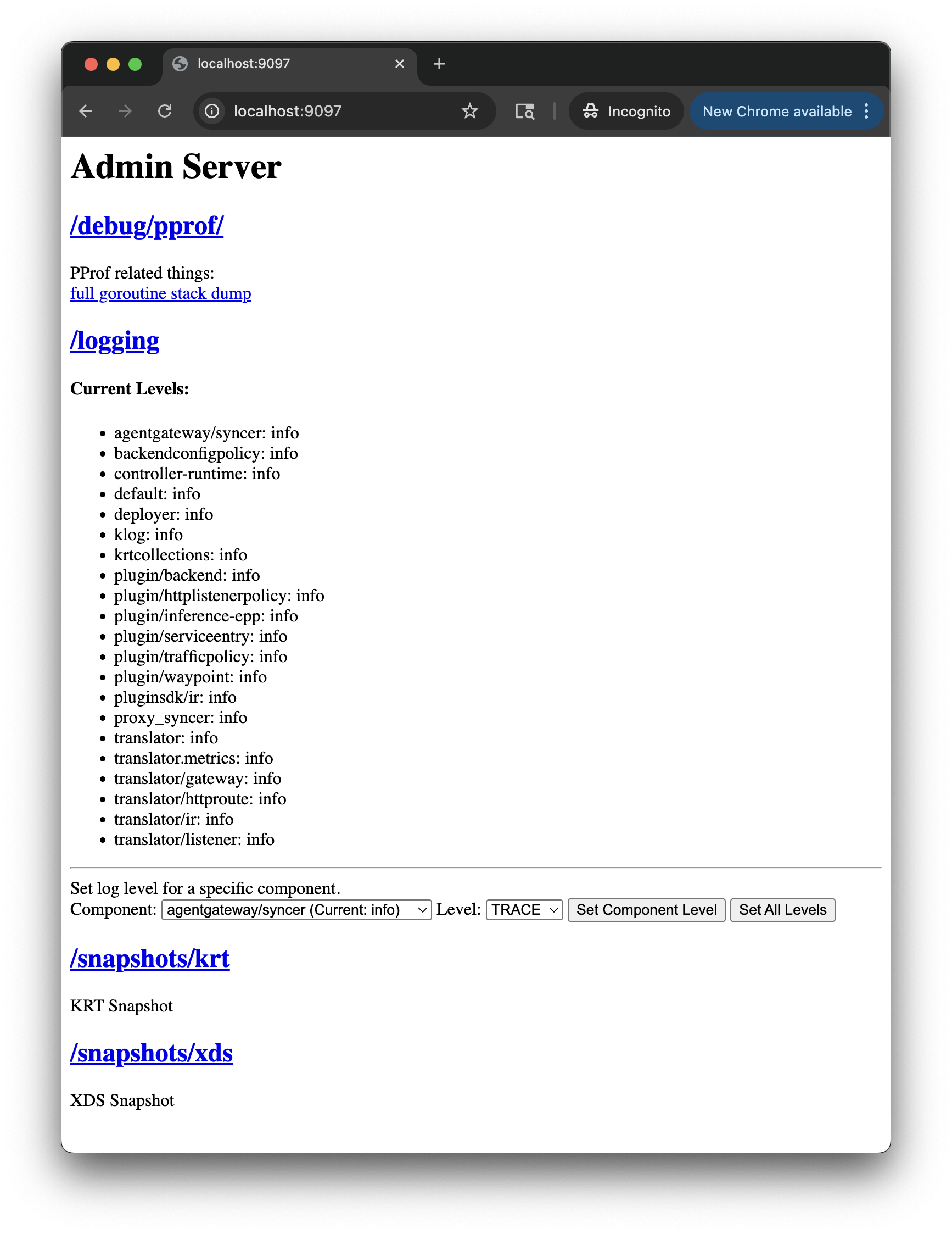 http://localhost:15000/config_dump Get the configuration that is available in the agentgateway proxy. Any custom resources that you create are translated in to agentgateway configuration. Depending on whether or not you enabled resource validation, you might have applied invalid configuration that is rejected in agentgateway.