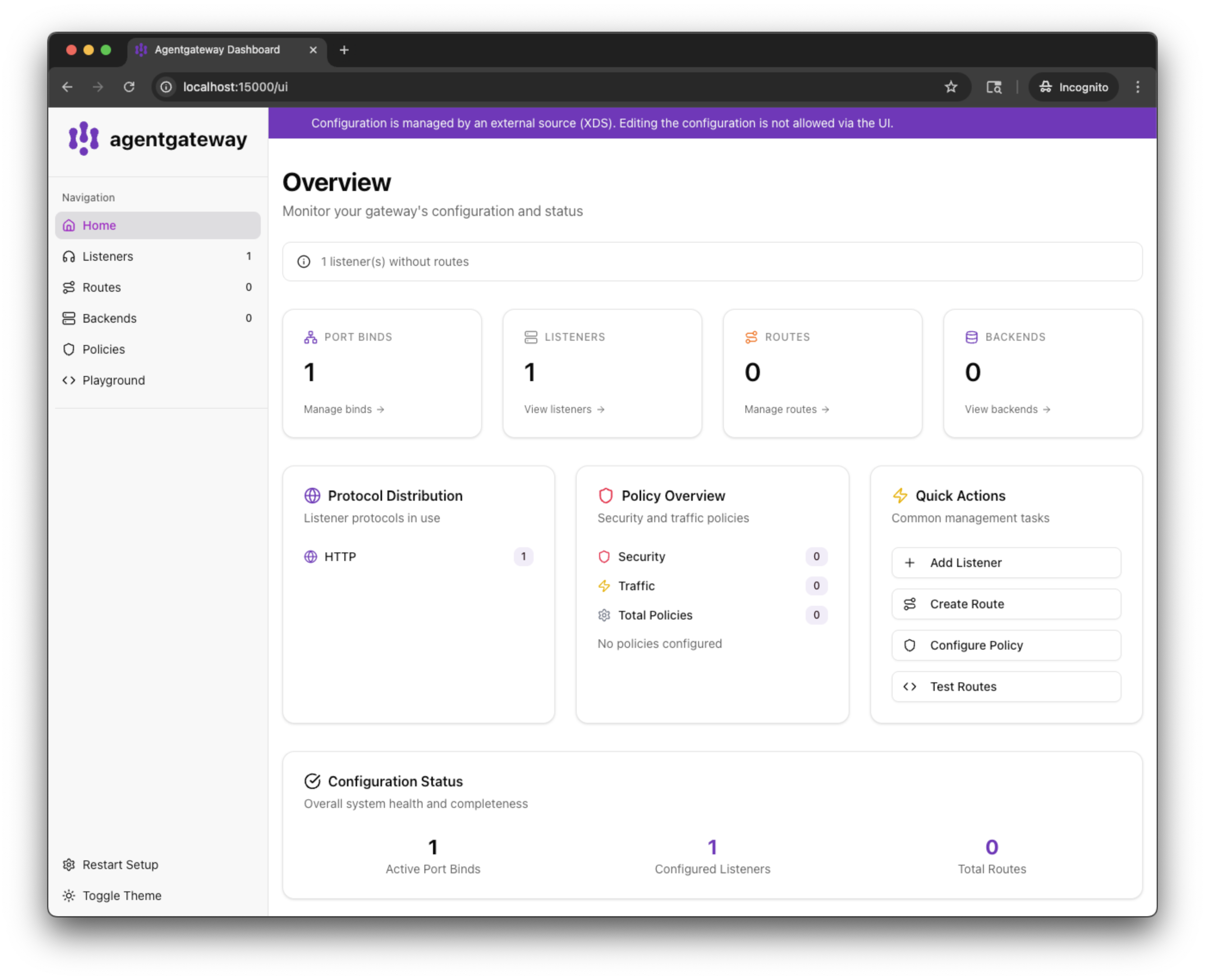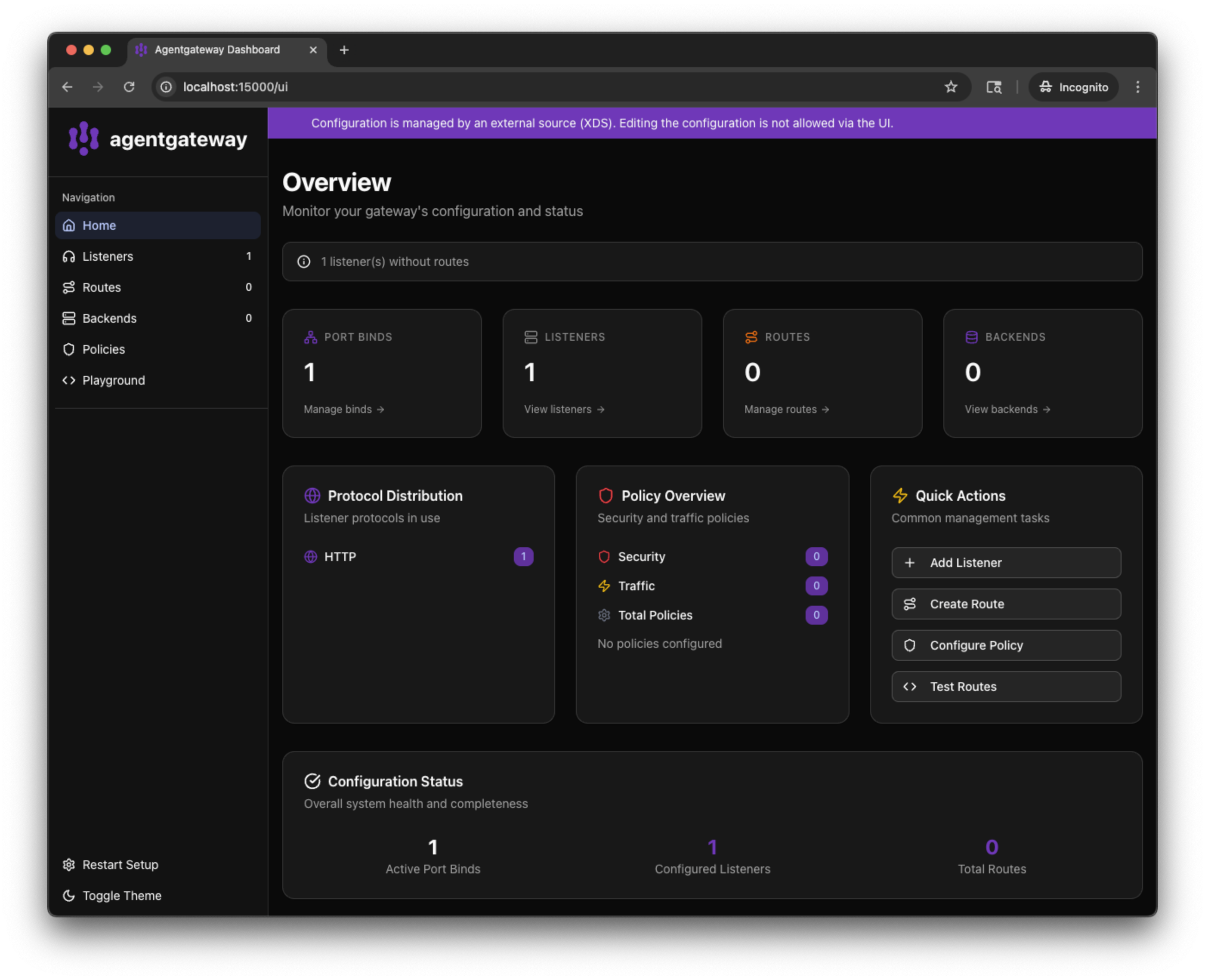 http://localhost:15000/ui A read-only user interface to review the agentgateway resources in your environment, such as listeners, routes, backends, and policies.